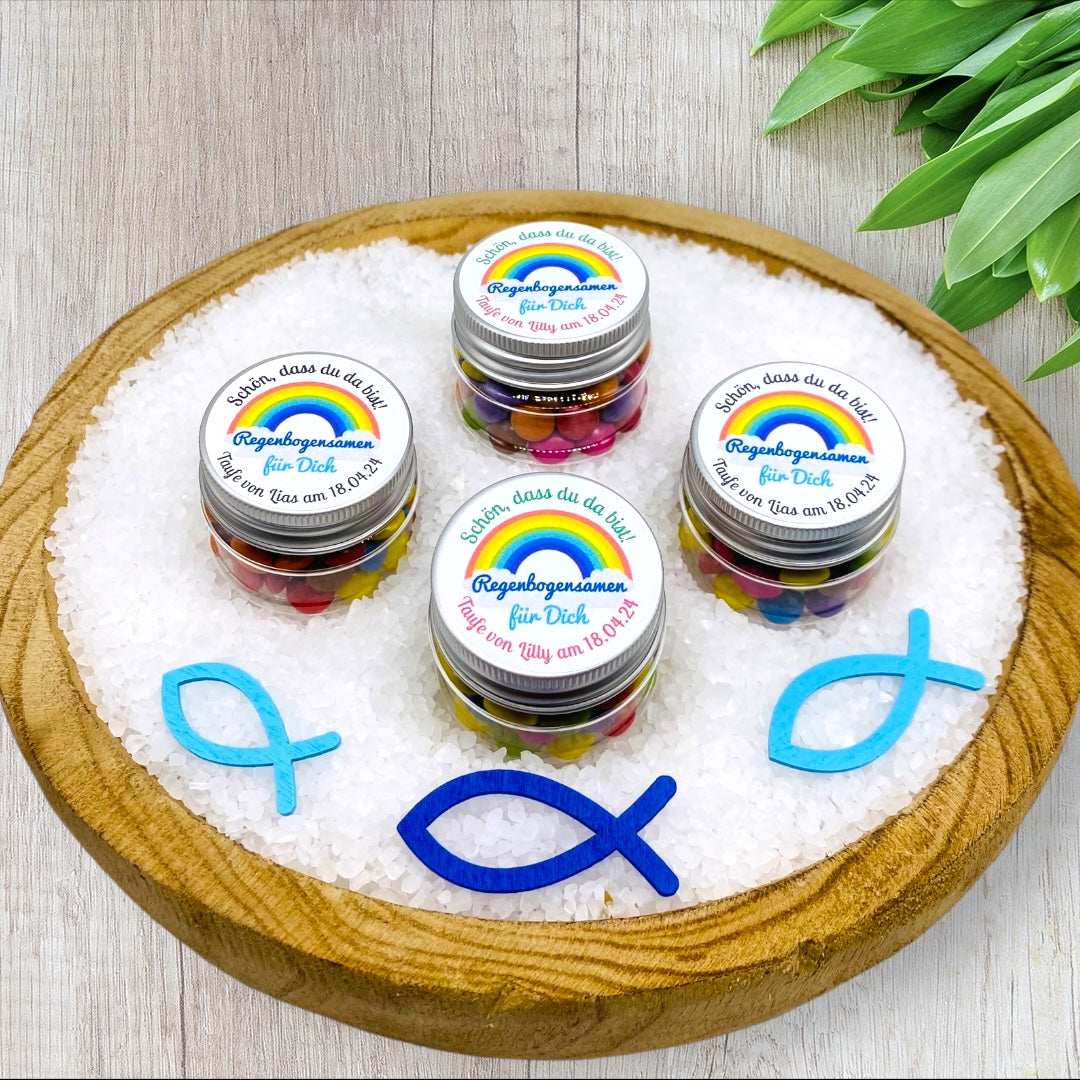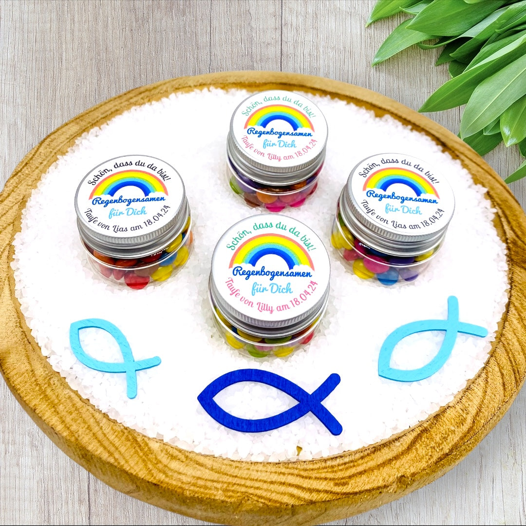 Eventuelt er der under regnbuen plads til lejligheden, navn og dato - en speciel personalisering til en unik gæstegave. Disse æsker er ikke kun søde, men også en kærlig måde at vise taknemmelighed og understrege, hvor dejligt det er, at gæster er der på denne særlige dag. Den perfekte kombination af farve, personligt præg og et strejf af magi til dåb, nadver eller konfirmation.