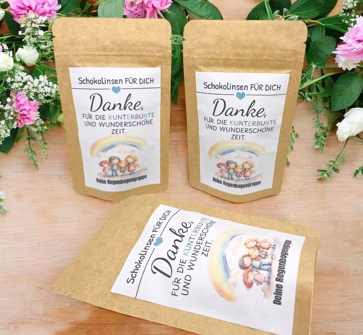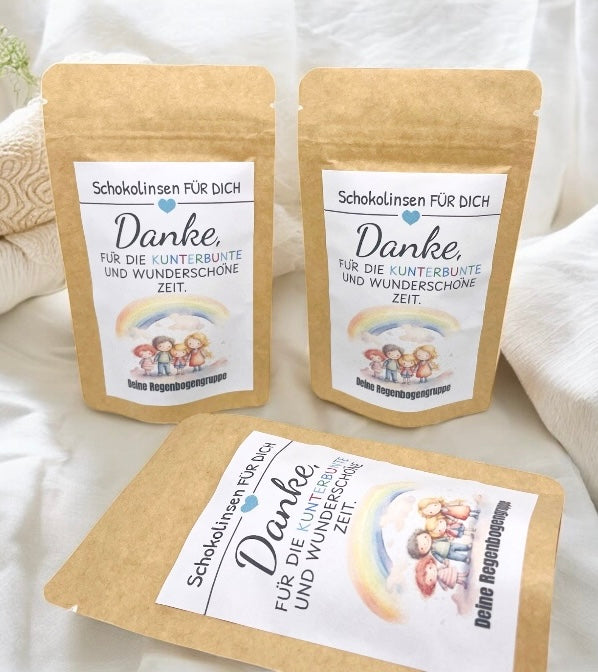Handgemachtes Abschiedsgeschenk für Erzieher, Lehrer oder Tagesmütter – gefüllt mit Schokolinsen, personalisiert & liebevoll gestaltet.